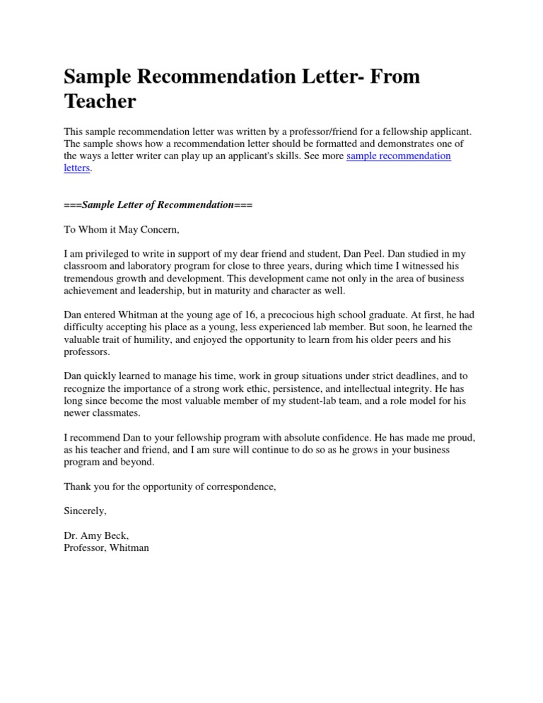 Sample Recommendation Letter From Teacher